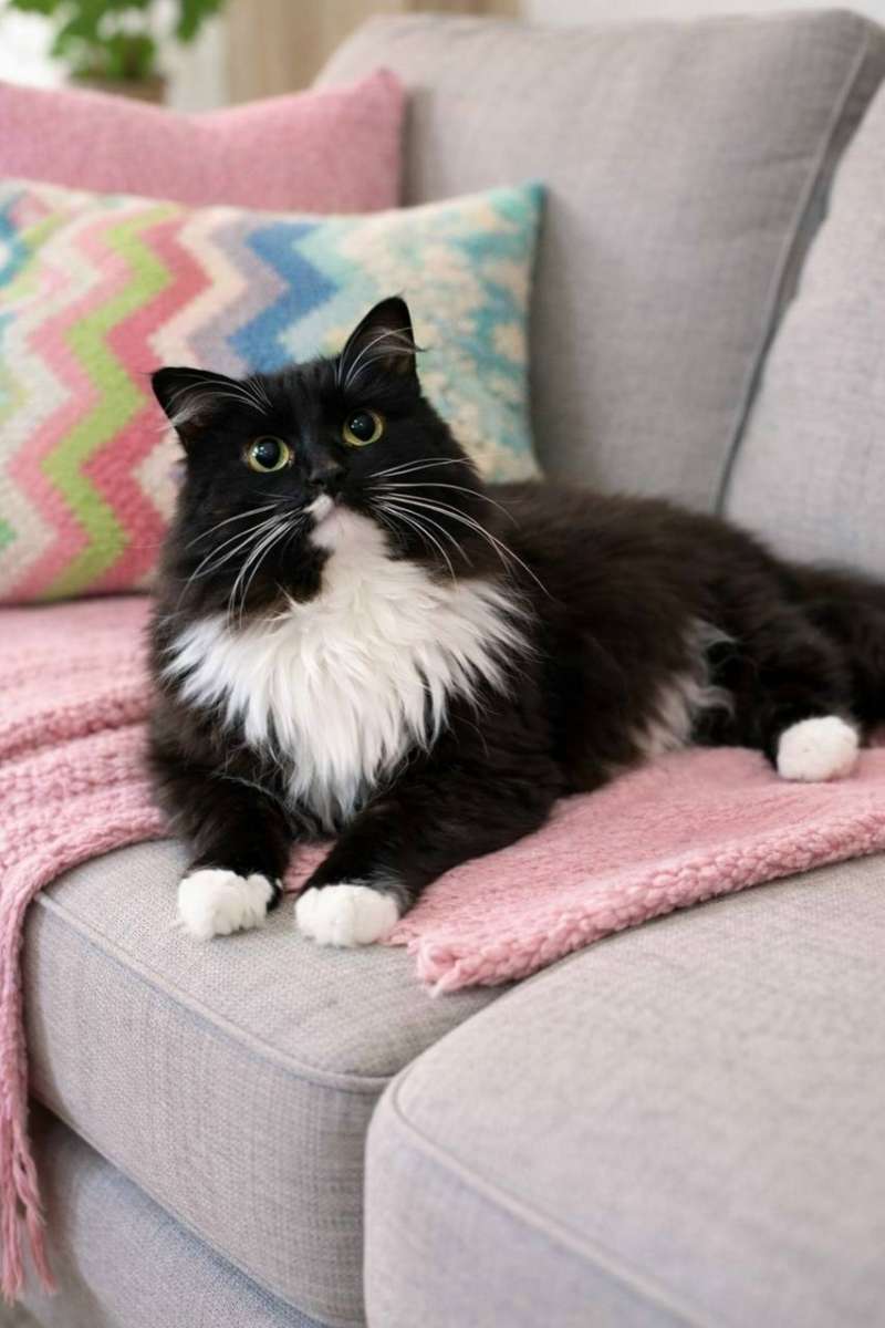 Красивая и ласковая кошечка Алька в добрые руки. Возраст кошечки 4-5 лет, стерилизована, к лотку приучена. Окрасом чёрно-белая, пушистая. Была спасена с подвала. По характеру ласкуша, но на руках сидеть не любит, предпочитает находиться рядом с человеком. У Альки лейкоз, но чувствует она себя замечательно и никаких препаратов не принимает. Только живёт в закрытой комнате, т. к. в квартире ещё 2 кота и кошка.